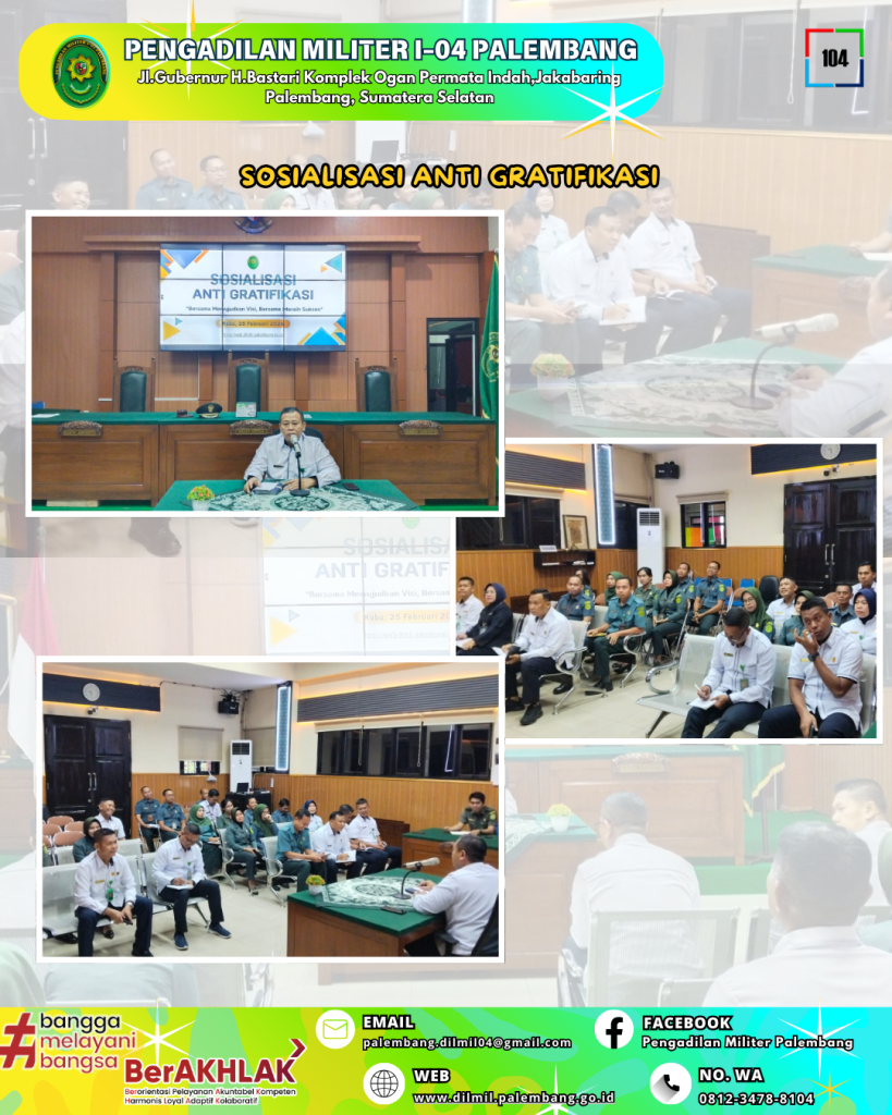 Komitmen terhadap integritas dan transparansi merupakan fondasi utama dalam mewujudkan peradilan yang bersih dan berwibawa. Di lingkungan Pengadilan Militer I-04 Palembang, semangat tersebut terus digaungkan melalui kampanye dan penegasan sikap anti gratifikasi yang dipimpin langsung oleh Plt. Kepala Pengadilan Militer I-04 Palembang, Letkol Chk Sudiyo, S.H., M.H.
