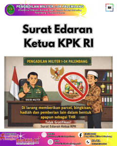 Dalam rangka menyambut Hari Raya, seluruh aparatur di lingkungan Pengadilan Militer I-04 Palembang diingatkan untuk terus menjaga integritas serta menjunjung tinggi prinsip transparansi dan akuntabilitas dalam pelaksanaan tugas dan fungsi peradilan. Momentum Hari Raya hendaknya tidak dimanfaatkan sebagai sarana pemberian hadiah atau bingkisan yang berpotensi menimbulkan praktik gratifikasi.